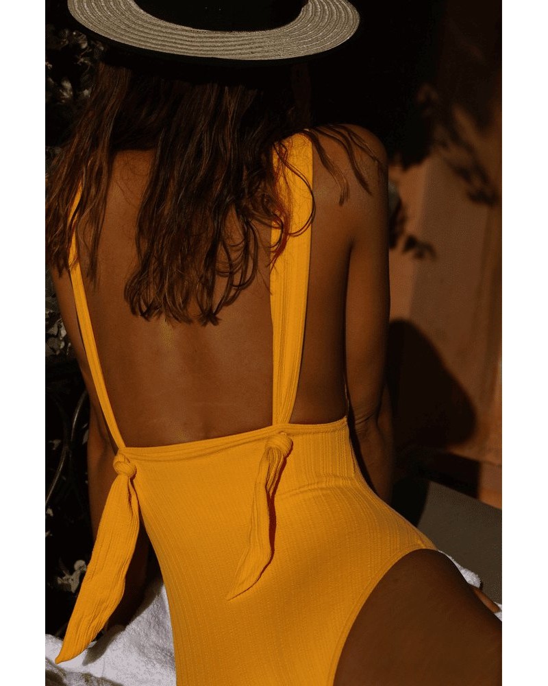 Le maillot de bain une pièce, le Délicieux, marie féminité et délicatesse grâce à son décolleté plongeant, son dos droit et ses bretelles nouées qui permettent un excellent maintien.